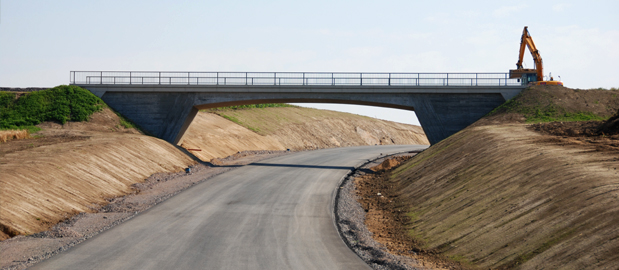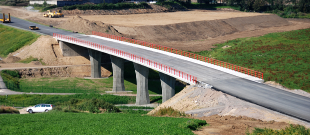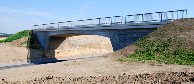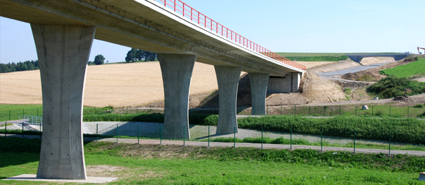 B174 OU Marienberg | BW10 - Brücke über das Tal am Reiterberg | Bauherr : Freistaat Sachsen vertreten durch das Straßenbauamt Chemnitz | Konstruktion : semiintegrales Bauwerk aus Ortbeton, schlaff bewehrt | Bauwerksdaten : Mittelträgerquerschnitt Stützweiten 18,15m - 4 x 25,0m - 18,15m Breite zw. Geländern 11,5m Brückenfläche 1568m² | Zeitraum : 2006 bis 2007 | Unsere Leistungen : Bauüberwachung, geometrisch vertragliche Prüfung